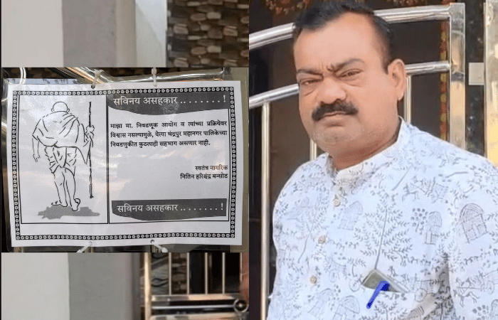 एकीकडे संपूर्ण राज्यात महानगरपालिका निवडणुकांचे बिगुल वाजले असून राजकीय वातावरण तापू लागले आहे, तर दुसरीकडे चंद्रपूरमध्ये एका जागरूक नागरिकाने निवडणूक प्रक्रियेवरच प्रश्नचिन्ह उपस्थित करत मतदानावर बहिष्कार टाकला आहे. निवडणूक आयोगाच्या कार्यपद्धतीवर विश्वास नसल्याचे सांगत या नागरिकाने पुकारलेल्या ‘सविनय असहकार’ आंदोलनाची सध्या शहरात जोरदार चर्चा सुरू आहे.
