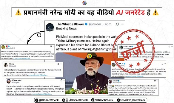 PIB ने पाकिस्तानी हँडल्सद्वारे व्हायरल केल्या जाणाऱ्या व्हिडिओची वस्तुस्थिती तपासली आणि असे लिहिले की असे व्हिडिओ देशातील सामाजिक सौहार्द आणि सौहार्द बिघडवण्याच्या वाईट हेतूने बनवले जात आहेत. हा AI जनरेट केलेला व्हिडिओ बनावट आहे. पंतप्रधान मोदींनी असे कोणतेही विधान केलेले नाही.