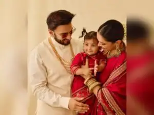 या फोटोमध्ये दीपिका लाल सिल्क सलवार कमीज आणि पारंपारिक सोन्याच्या दागिन्यांमध्ये अतिशय आकर्षक दिसत आहे. तिचे केस चमेलीच्या फुलांच्या माळाने सजलेले आहेत. तर, रणवीर सिंग त्याच्या खास स्टाइलमध्ये हस्तिदंती शेरवानी आणि मोत्यांचा हार घालून दिसला. त्यांची मुलगी दुआ लहान लाल ड्रेसमध्ये सुंदर दिसत होती, तिच्या लहान पोनीटेल्सने चित्र आणखी मोहक बनवले होते.