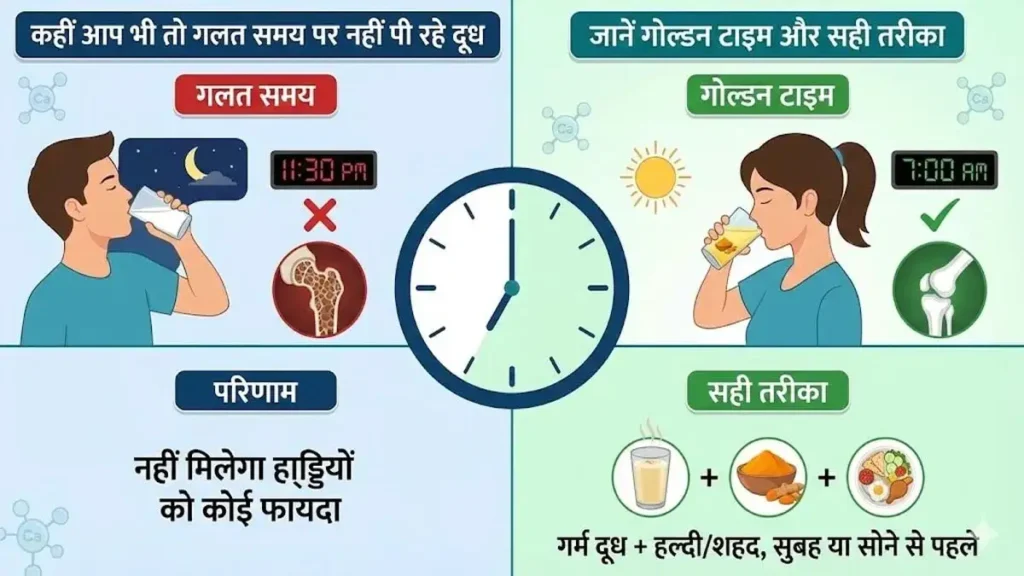 बरेच लोक सकाळी रिकाम्या पोटी किंवा रात्री झोपण्यापूर्वी दूध पितात, जे फायदेशीर आहे. परंतु जर तुमचा उद्देश हाडे मजबूत करण्याचा असेल तर व्यायामानंतरची दिवसाची वेळ सर्वात प्रभावी आहे.