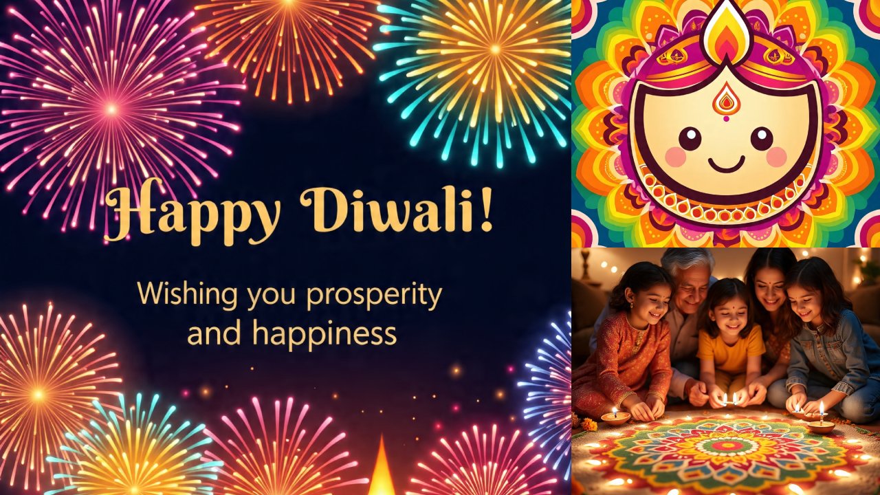 - “कौटुंबिक दिवे, रंगीबेरंगी रांगोळी, सणासुदीचे दिवे असलेले सुंदर दिवाळी देखावे”