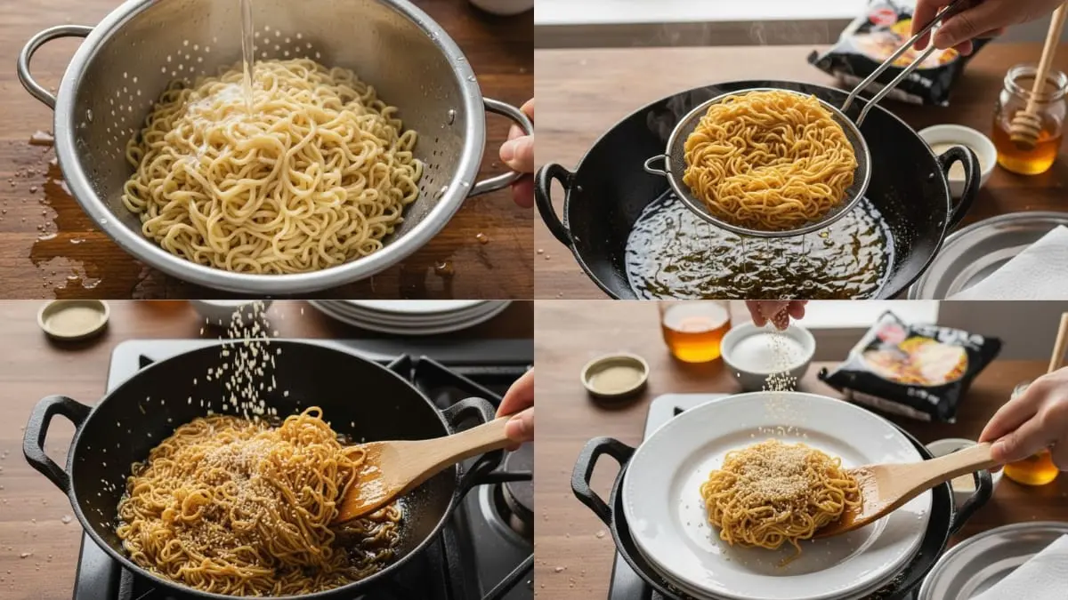 तुमचे मधुर मध तळलेले नूडल्स तयार आहेत! त्यांना लगेच सर्व्हिंग प्लेटवर काढा. तुमची इच्छा असल्यास, तुम्ही वर आणखी काही तीळ शिंपडू शकता, किंवा बदाम किंवा काजूसारखे बारीक चिरलेले काजू घालू शकता, हे पूर्णपणे ऐच्छिक आहे, परंतु चव वाढवू शकते.