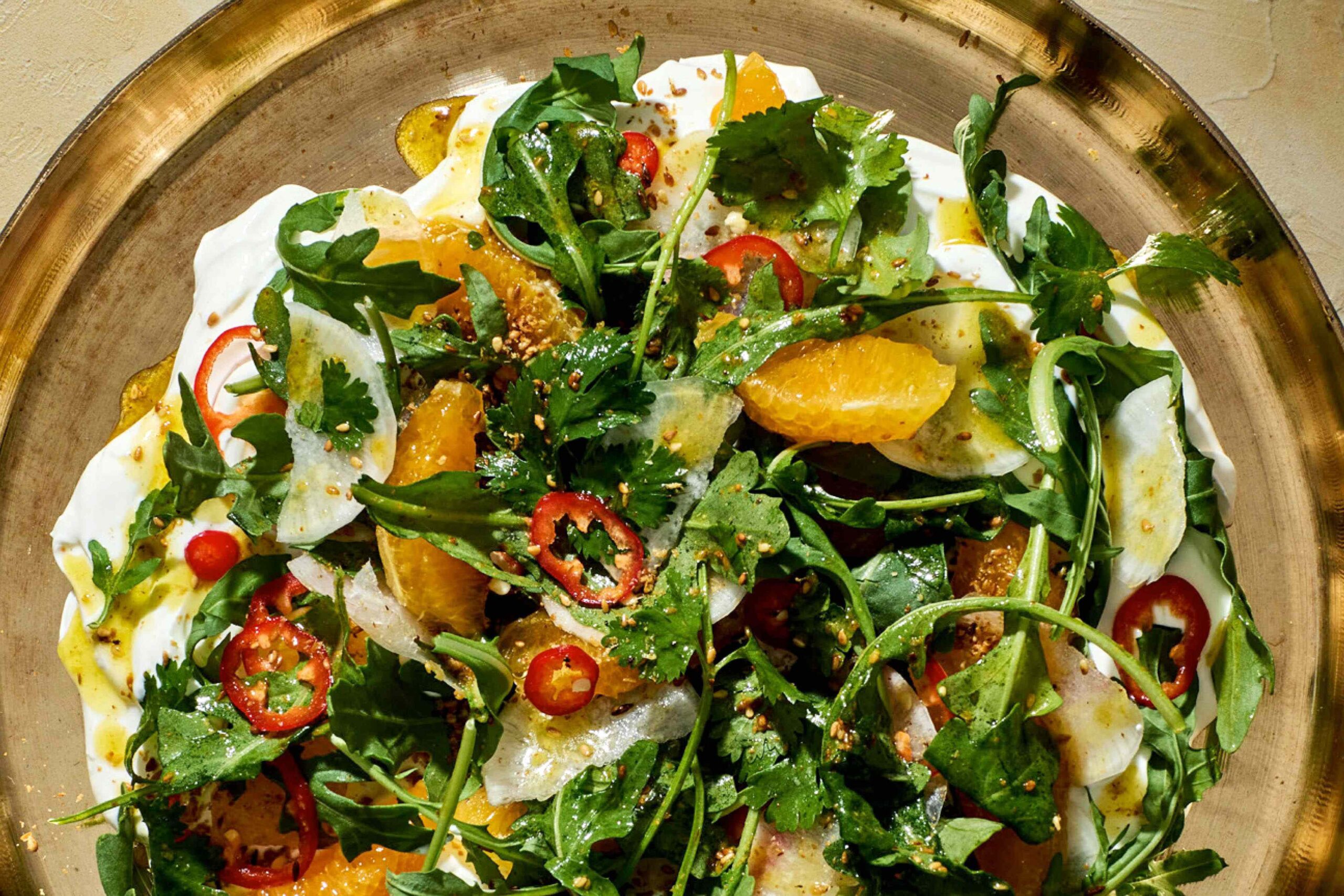 तीळ-जिरे ड्रेसिंगसह डायकॉन आणि ऑरेंज सॅलड