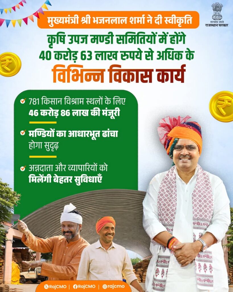 मुख्यमंत्री श्री भजनलाल शर्मा यांच्या नेतृत्वाखाली राजस्थान सरकार राज्याची कृषी व्यवस्था बळकट करण्यासाठी आणि शेतकऱ्यांना चांगल्या सुविधा देण्यासाठी सतत काम करत आहे. या क्रमाने राज्याचे मुख्यमंत्री ना कृषी उत्पन्न बाजार समित्यांमध्ये 40 कोटी 63 लाखांहून अधिक रुपयांची विकासकामे मंजूर केले आहे.