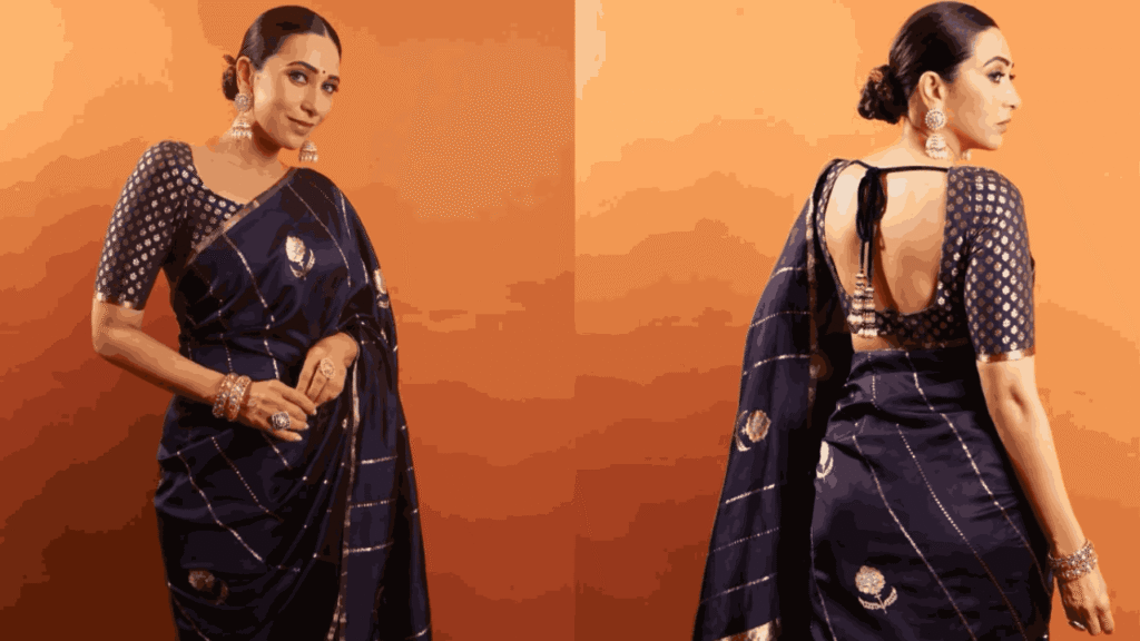 या दिवाळीत तुम्ही करिश्मा कपूरसारखा बनारसी साडीचा लूक अंगीकारू शकता. ही साडी तुम्हाला स्टायलिश आणि मोहक सणाचा माहोल देईल, जी दिवाळीसाठी योग्य आहे.