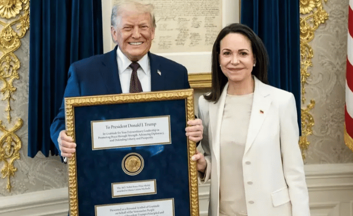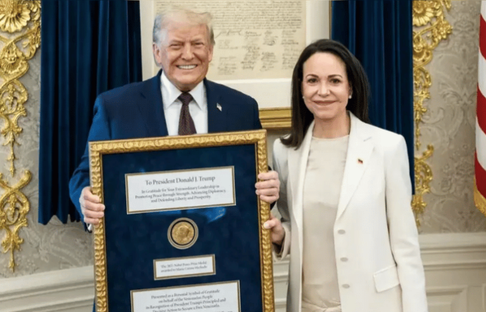 व्हेनेझुएलाच्या विरोधी पक्षनेत्या आणि नोबेल विजेत्या मारिया कोरिना मचाडो यांनी आपला पुरस्कार ट्रम्प यांना देण्याची घोषणा केली. गुरुवारी व्हाईट हाऊसमध्ये मचाडो आणि ट्रम्प यांच्यात बैठक झाली होती. या बैठकीनंतर मचाडो यांनी आपल्याला मिळालेला नोबेल शांतता पुरस्कार ट्रम्प यांना भेट दिल्याचे म्हटले. डोनाल्ड ट्रम्प यांनीही याबाबत सोशल मीडियावर पोस्ट करत माहिती दिली.