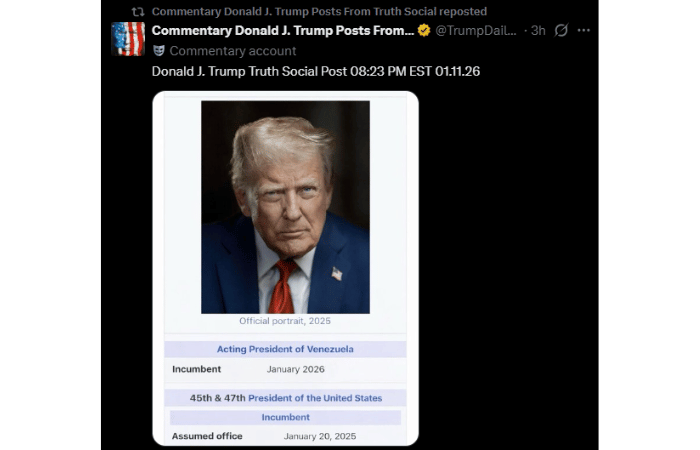 अमेरिकेचे राष्ट्राध्यक्ष डोनाल्ड ट्रम्प यांनी त्यांच्या सोशल मीडिया प्लॅटफॉर्म, ट्रुथ सोशलवर एक पोस्ट शेअर करून आंतरराष्ट्रीय स्तरावर खळबळ उडवून दिली आहे. ट्रम्पच्या अधिकृत फोटोसह पोस्टमध्ये असे म्हटले आहे की, ते सध्या व्हेनेझुएलाचे “कार्यवाहक राष्ट्रपती” आहेत. त्यांनी २० जानेवारी २०२५ रोजी पदभार स्वीकारत अमेरिकेचे ४५ वे आणि ४७ वे राष्ट्राध्यक्ष म्हणून स्वतःची ओळख करून दिली.