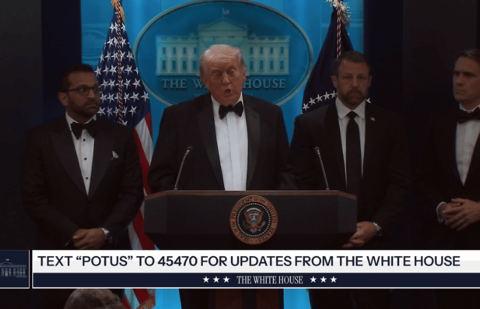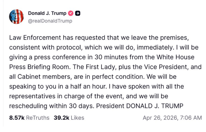 जगप्रसिद्ध व्हाइट हाउस कॉरेस्पोंडेंट्स डिनर कार्यक्रमात अमेरिकेचे राष्ट्राध्यक्ष डोनाल्ड ट्रम्प यांच्यासमोरच गोळीबाराची धक्कादायक घटना घडली आहे. या हल्ल्यातून ट्रम्प बालंबाल बचावले असून त्यांनी स्वत: आपण आणि आपले सर्व सहकारी सुरक्षित असल्याचे जाहीर केले आहे. अचानक झालेल्या या गोळीबारानंतर सिक्रेट सर्व्हिसच्या एजंटने हातामध्ये शस्त्र घेऊन संपूर्ण परिसराचा ताबा घेतला. या घटनेनंतर अमेरिकेसह जगभरात खळबळ उडाली आहे. यावर आता ट्रम्प यांनीही पहिली प्रतिक्रिया दिली असून त्यांनी सुरक्षा यंत्रणांच्या तत्परतेचे तोंडभरून कौतुक केले आहे.