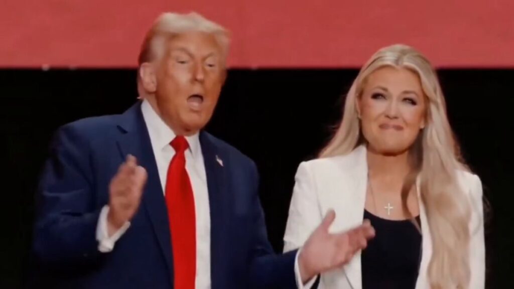 व्हायरल व्हिडिओमध्ये, ट्रम्प यांनी 'अमेरिका' हा शब्द 'अमेरिका द ब्युटीफुल' गायल्यामुळे “अमेरिका” हा शब्द लिप-सिंचिंग करताना दिसू शकतो आणि चार्लीच्या विधवेच्या एरिकाच्या चेह on ्यावर थोडक्यात हसू घालणारा एक छोटासा नृत्य करतो.