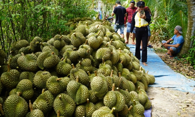 मेकाँग डेल्टामध्ये ड्युरियन्सची कापणी केली जाते. रीड/होआंग नम द्वारे फोटो |