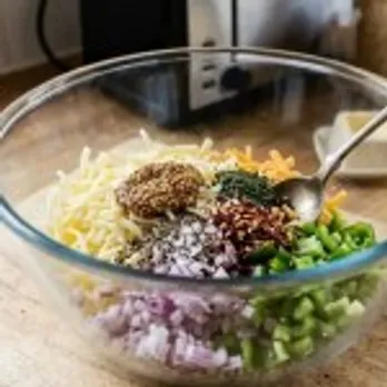 एका मोठ्या भांड्यात किसलेले चीज, बारीक चिरलेला कांदा आणि सिमला मिरची घाला. यानंतर त्यात मोहरी, बारीक ठेचलेली लाल मिरची, सुका पुदिना, मीठ आणि काळी मिरी घालून सर्वकाही चांगले मिसळा.