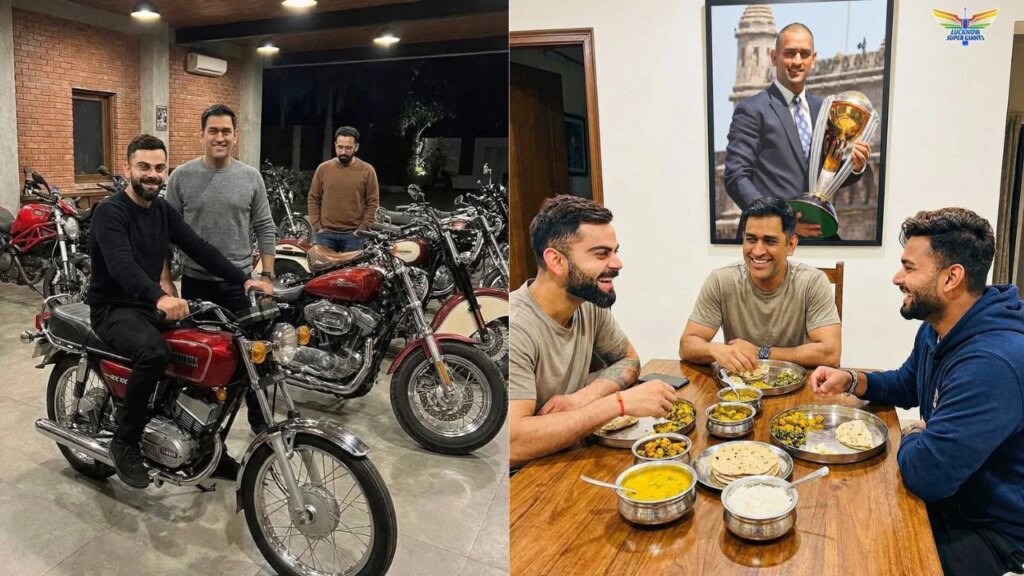 रांची: धोनीचे विराट कोहली आणि महेंद्र सिंगचे दोन फोटो सोशल मीडियावर व्हायरल होत आहेत. एका चित्रात विराट कोहली त्याच्या माजी कर्णधाराच्या बाईक कलेक्शनकडे बघत एक फोटो काढत होता. एक व्यक्ती मागे उभी आहे आणि शांतपणे या गोष्टी पाहत आहे. दुसरा फोटो धोनीच्या घरातील डिनर पार्टीचा असल्याचे सांगण्यात येत आहे ज्यात धोनी आणि कोहलीसोबत ऋषभ पंत उपस्थित आहे. यामध्ये तिघेही टेबलावर बसून रोटी, डाळ, भाजी खाताना आणि गप्पा मारताना दिसत आहेत.