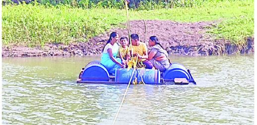 केलेल्या तराफावरून शेतकरी, महिला, शालेय विद्यार्थ्यांना जीव धोक्यात घालून ये-जा करावी लागते.
