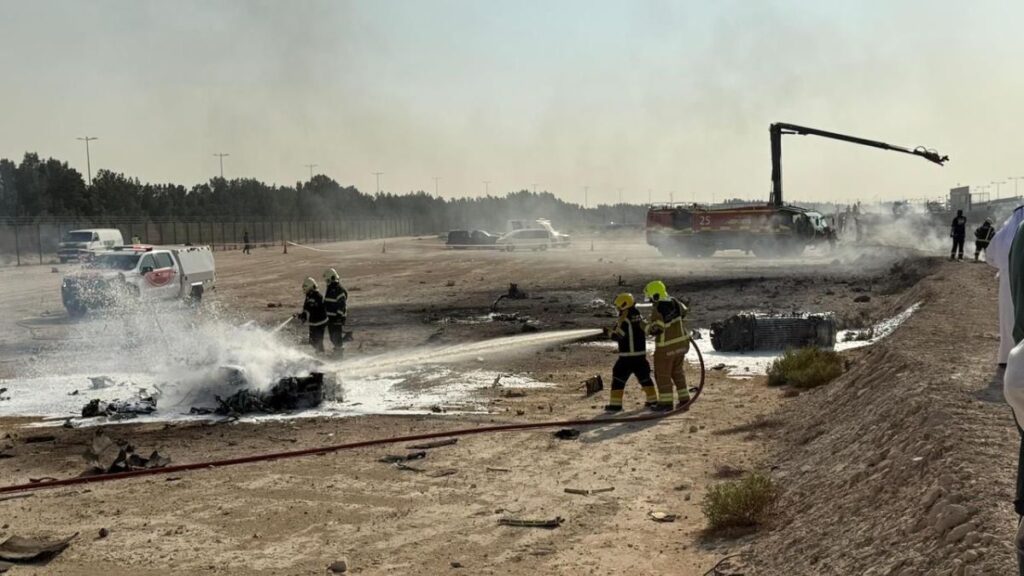 दुबई एअरशो 2025 च्या क्रॅश साइटवरून उगवलेल्या एका स्पष्ट प्रतिमेने भारतीय वायुसेनेच्या तेजस लढाऊ विमानाच्या अपघाताचा विनाशकारी परिणाम लक्षांत आणला आहे. उच्च-तीव्रतेच्या एरोबॅटिक दिनचर्यादरम्यान विमान खाली गेल्याच्या काही क्षणानंतर, छायाचित्रात अग्निशमन दल जळलेल्या जमिनीवर विखुरलेल्या धुराच्या ढिगाऱ्याशी झुंज देत असल्याचे दाखवते. धूर, पिळलेल्या धातूचे तुकडे, आणीबाणीची वाहने आणि परिणाम रोखण्यासाठी तातडीने काम करणारे प्रतिसादकर्ते यांनी दृश्य भरलेले आहे.