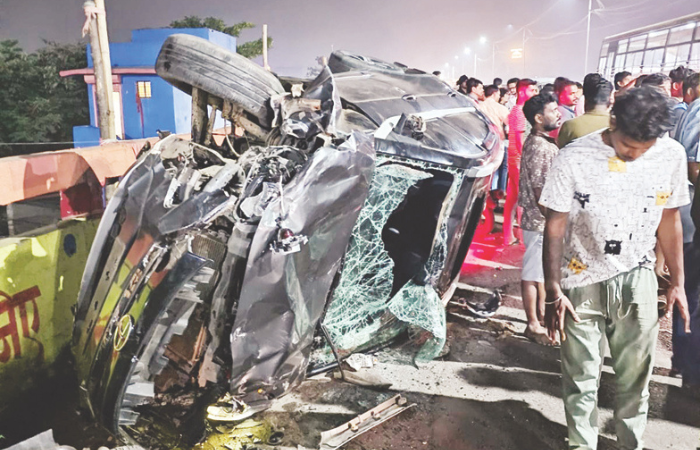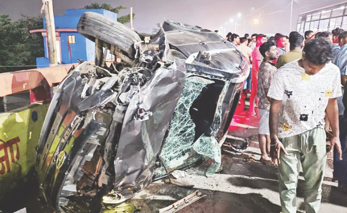 अंबरनाथ शहराच्या पूर्व आणि पश्चिम भागाला जोडणाऱय उड्डाणपुलावर आज रात्री भीषण अपघात झाला. शिंदे गटाच्या उमेदवार किरण चौबे यांच्या भरधाव कारने लेन तोडत विरुद्ध दिशेने येणाऱ्या दुचाकीस्वारांना अक्षरशः चिरडले. त्यात एक दुचाकीस्वार थेट पुलावरून खाली कोसळला. ही घटना सीसी टिव्हीत कैद झाली.अपघातात चार जण जागीच ठार झाले.