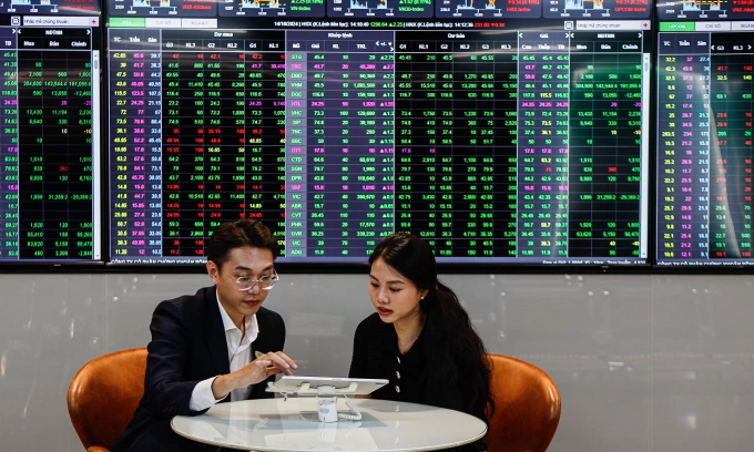 हो ची मिन्ह सिटीमधील सिक्युरिटीज फर्ममधील पडद्यावरील स्टॉक किंमतींकडे दोन गुंतवणूकदार पाहतात. Vnexpress/an khuong द्वारे फोटो