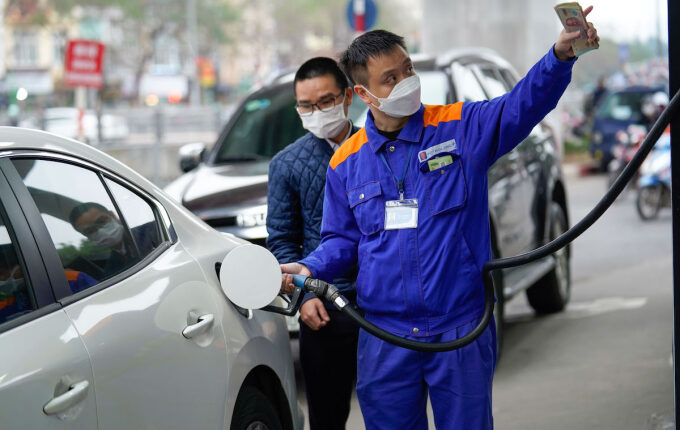2022 मध्ये हनोईमधील इंधन स्टेशनवर एक कर्मचारी कार रिफिल करत आहे. वाचा/फाम चीयूचा फोटो