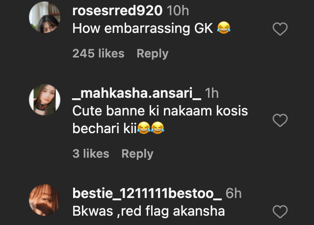 दुसऱ्याने टिप्पणी केली, “खूप लाजिरवाणी! कोणतीही अभिजातता, कोणतेही मानक नाही – जीके तिच्यासाठी पात्र नाही. तो प्रौढ आणि किमान चांगले वागतो.”