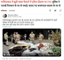 वास्तविक, 18 ऑक्टोबर 2022 रोजी गाझियाबाद पोलिसांनी रिजवान नावाच्या व्यक्तीला अवैध फटाक्यांसह अटक केली होती. यावेळी अटकेचा व्हिडिओही बनवण्यात आला. हाच व्हिडिओ 20 ऑक्टोबर 2022 रोजी @YasmeeKhan_786 नावाच्या X ने आरोपी बजरंग दलाचा असल्याचा खोटा दावा करून शेअर केला होता.