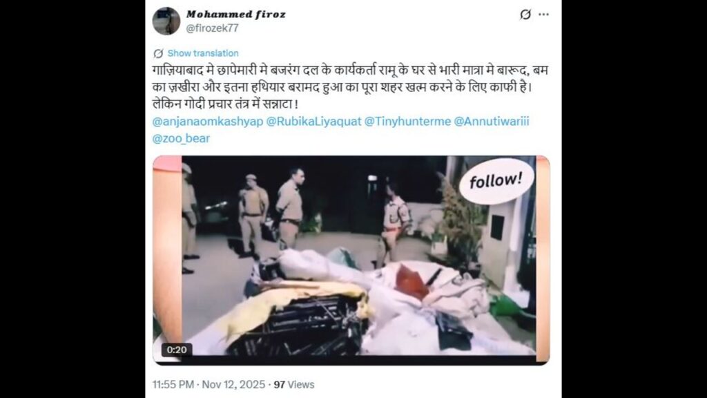 केंद्र सरकारने 10 नोव्हेंबर रोजी दिल्लीत झालेल्या स्फोटाचे वर्णन दहशतवादी घटना म्हणून केले आहे. दरम्यान, सोशल मीडियावर एक व्हिडिओ व्हायरल होत आहे, ज्यामध्ये गाझियाबादमधील बजरंग दलाच्या कार्यकर्त्याच्या घरातून मोठ्या प्रमाणात बॉम्ब आणि शस्त्रे सापडल्याचा दावा केला जात आहे. पोलिस आणि पोत्यांमध्ये ठेवलेले सामान व्हिडिओत दिसत आहे.
