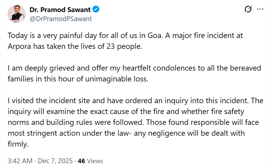 सीएम सावंत यांनी X वर पोस्ट करून सांगितले की, आजचा दिवस गोव्यासाठी खूप दुःखद आहे. अर्पोरा येथे लागलेल्या भीषण आगीत 23 जणांचा मृत्यू झाला. मी अत्यंत दु:खी आहे आणि या कठीण काळात सर्व पीडित कुटुंबांप्रती माझ्या संवेदना व्यक्त करतो. मी घटनास्थळी जाऊन परिस्थिती पाहिली आणि या घटनेच्या चौकशीचे आदेश दिले आहेत.