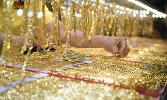 हो ची मिन्ह सिटीमधील एका दुकानात एक व्यक्ती सोन्याचे दागिने मांडत आहे. VnExpress/Thanh Tung द्वारे फोटो