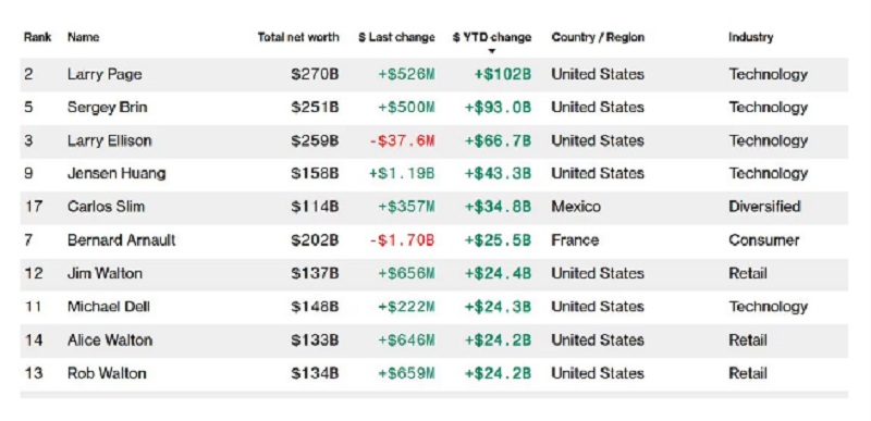 त्याच वेळी, ओरॅकलचे संस्थापक लॅरी एलिसन यांची एकूण संपत्ती $259 अब्ज आहे. त्याचा YTD (इयर टू डेट) नफा $67.7 बिलियन आहे, ज्यामुळे तो टॉप श्रीमंतांच्या यादीत तिसऱ्या स्थानावर आहे. तंत्रज्ञान क्षेत्राच्या बाहेर, मेक्सिकोच्या कार्लोस स्लिमने देखील $34.8 अब्ज वार्षिक नफा कमावला, तर फ्रान्सच्या बर्नार्ड अर्नॉल्टने चीनच्या कमोडिटी मार्केटमध्ये मोठ्या नफ्यामुळे $25.5 अब्ज कमावले.