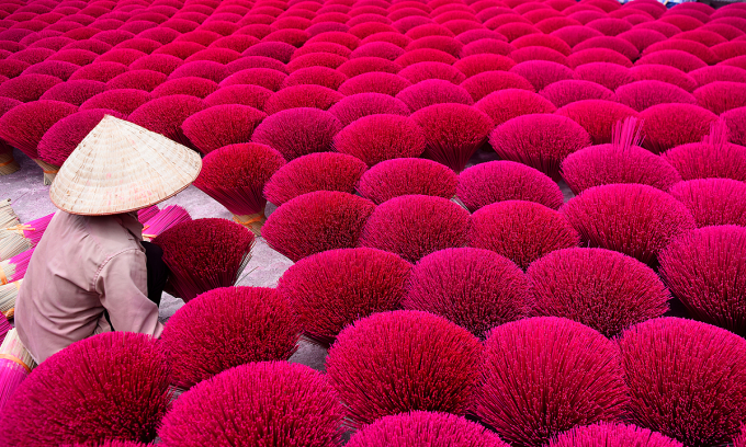 हनोईमधील क्वांग फु काऊ गावात एक महिला अंगणात अगरबत्ती गोळा करते. वाचा/गियांग ह्यू द्वारे फोटो