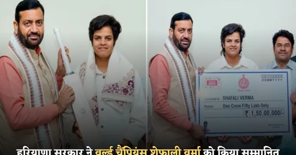हरियाणा: हरियाणा सरकारने वर्ल्ड चॅम्पियन शेफाली वर्माचा गौरव केला, तिला 1.5 कोटी रुपयांचे बक्षीस आणि ए-ग्रेड प्रमाणपत्र मिळाले.