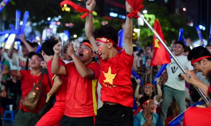 Nguyen Hue वॉकिंग स्ट्रीट, HCMC वरील चाहते, 11 मे 2023 रोजी, 32 SEA गेम्समध्ये थायलंड विरुद्ध व्हिएतनामचा स्कोअर म्हणून आनंद साजरा करत आहेत. वाचा/थान तुंग यांनी घेतलेला फोटो |