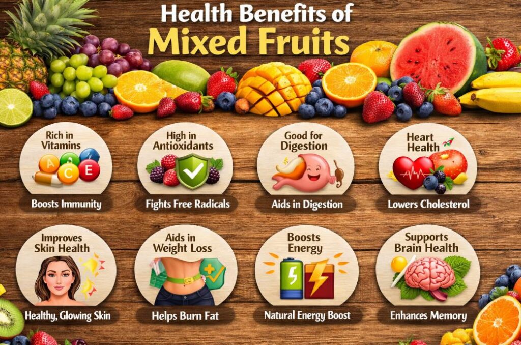 मिश्र फळांमध्ये भरपूर जीवनसत्त्वे, खनिजे, फायबर आणि अँटिऑक्सिडंट असतात. हे शरीराची प्रतिकारशक्ती मजबूत करतात, ज्यामुळे रोगांशी लढण्याची क्षमता वाढते. विशेषत: संत्रा, सफरचंद, केळी, पपई आणि डाळिंब या फळांचे मिश्रण शरीराला व्हिटॅमिन सी, लोह आणि पोटॅशियम प्रदान करते.
