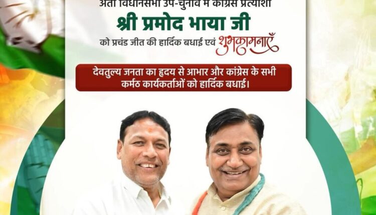 नवनिर्वाचित आमदार प्रमोद भय्या यांचे अभिनंदन करून, दोतसरांनी त्यांना उज्ज्वल कार्यकाळासाठी शुभेच्छा दिल्या. ते म्हणाले की, प्रमोद भय्या यांचा विजय हा काँग्रेस संघटनेच्या ताकदीचा पुरावा तर आहेच, पण तो जनतेच्या अंताप्रती असलेल्या इच्छा आणि विश्वासाचे थेट प्रतिबिंब आहे. काँग्रेसच्या उमेदवाराला जनतेने दिलेला भक्कम पाठिंबा आगामी काळात चांगल्या विकासाच्या आणि सुशासनाच्या आशेला नवा आयाम देईल, असे दोतासरा म्हणाले. प्रमोद भय्या जनतेच्या अपेक्षांवर खरा उतरतील आणि अंता भागातील विकासाची नवी दिशा प्रस्थापित करतील, असा विश्वास त्यांनी व्यक्त केला.