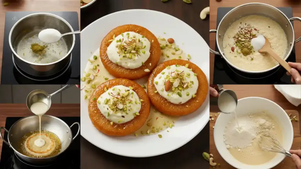 ![एका पॅनमध्ये साखर आणि पाणी उकळून साखरेचा पाक तयार करा; वेलची पावडर आणि केशर घालून हलकी एक-स्ट्रिंग सुसंगतता बनवा.]()
