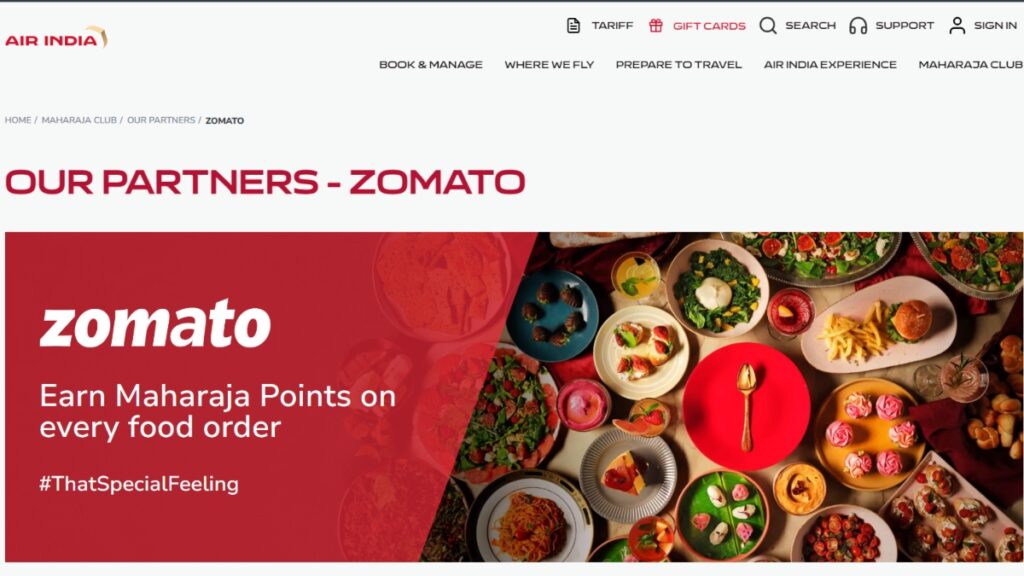 - नवीन महाराजा क्लब सदस्यांसाठी आपले स्वागत आहे: एअर इंडियाच्या महाराजा क्लब लॉयल्टी प्रोग्राममध्ये प्रवेश घेतलेल्या आणि झोमाटोद्वारे त्यांची खाती जोडल्यास नवीन वापरकर्त्यांना एअर इंडिया (भविष्यातील प्रवासाच्या बक्षिसेसाठी रीडीमेट करण्यायोग्य) पूर्ण झाल्यावर २,००० महाराज पॉईंट्सचा बोनस मिळेल.