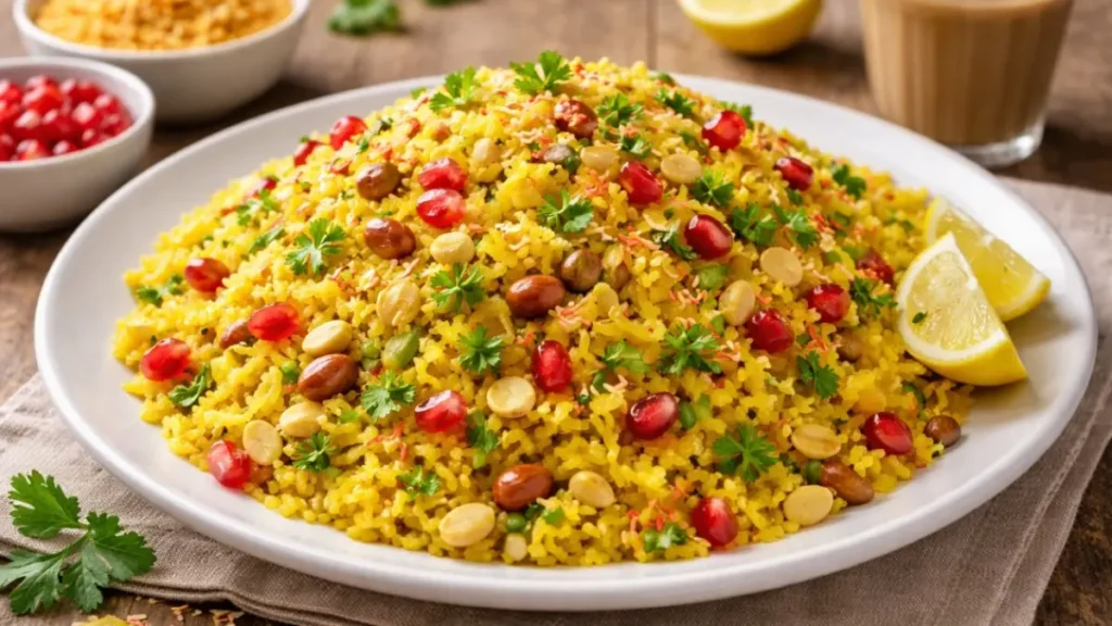 मंद आचेवर २-३ मिनिटे शिजवा. गॅस बंद करण्यापूर्वी त्यात लिंबाचा रस घालून मिक्स करा. लिंबू आणि साखरेचा हा समतोल पोह्यांना परिपूर्ण आंबट-गोड चव देतो. तयार पोहे सर्व्हिंग प्लेटमध्ये काढा. हिरवी धणे, डाळिंबाचे दाणे आणि शेव घालून सजवा.