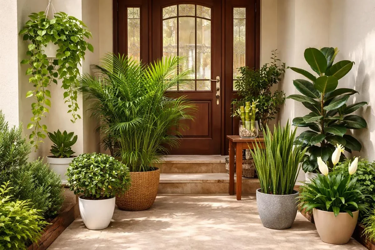 भारतीय संस्कृतीत तुळशीच्या झाडाला खूप महत्त्व आहे. घराच्या दारासमोर तुळशीचा माळ लावणे खूप शुभ असते. हे नकारात्मक उर्जेला घरात प्रवेश करण्यापासून रोखते. याशिवाय तुळशी हे नैसर्गिक वायु शुद्ध करणारे देखील आहे. त्याचप्रमाणे, प्रवेशद्वारावर उगवलेला मनी प्लांट श्री आणि समृद्धी आकर्षित करतो. जर लता वर चढत असेल तर ते आर्थिक समृद्धीचे संकेत देते. हे घरातील हवेतील विष काढून टाकते आणि ताजेपणा राखते.