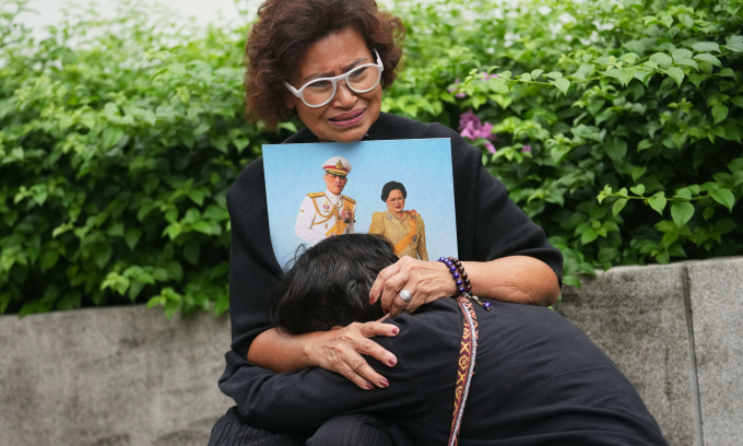 | 25 ऑक्टोबर 2025 रोजी बँकॉक, थायलंड येथे थायलंड राणी मदर सिरिकित यांचे पोर्ट्रेट धारण करत असताना थाई लोक शोक करत आहेत. फोटो एपी |