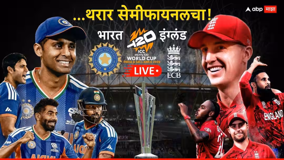 IND vs ENG LIVE Update T20 World Cup Semi Final 2026 : आयसीसी टी-20 वर्ल्ड कपच्या अंतिम फेरीत खेळणाऱ्या दुसऱ्या संघाचे आज नाव निश्चित होणार आहे. टीम इंडिया मुंबईतील ऐतिहासिक वानखेडे स्टेडियम येथे इंग्लंडविरुद्ध मैदानात उतरणार आहे. या स्पर्धेत दोन्ही संघांमध्ये उपांत्य फेरीत सामना होण्याची ही सलग तिसरी वेळ ठरणार आहे. मागील वेळी भारताने इंग्लंडला पराभूत करत अंतिम फेरीत प्रवेश केला होता. त्यानंतर रोहित शर्माच्या नेतृत्वाखाली भारताने दक्षिण आफ्रिकेला रोमांचक सामन्यात हरवत ट्रॉफी उंचावली होती.