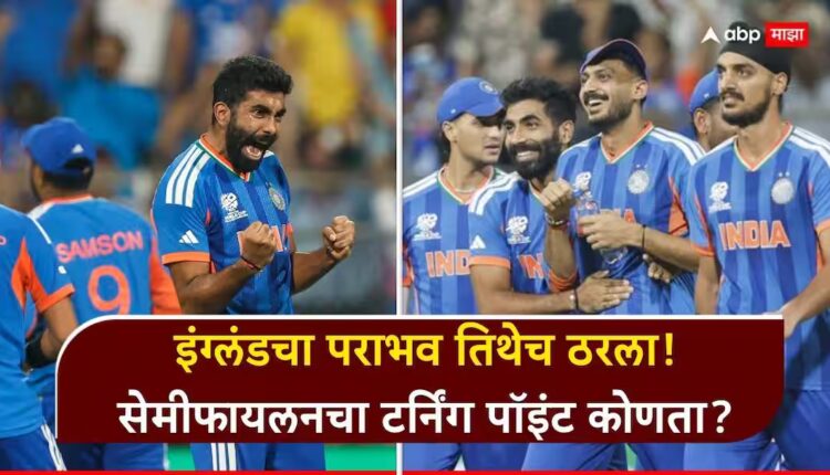IND vs ENG सेमीफायनल टर्निंग पॉइंट: टीम इंडियानं इंग्लंडचा पराभव करून यंदाच्या आयसीसी टी-20 विश्वचषकाच्या अंतिम फेरीत धडक मारली आहे. मुंबईच्या वानखेडे स्टेडियमवर झालेल्या या चुरशीच्या सामन्यात भारतानं इंग्लंडवर 7 धावांनी मात केली. भारतानं दिलेल्या 254 धावांच्या आव्हानाचा पाठलाग करताना इंग्लंडच्या फलंदाजांनी कडवी झुंज दिली. खासकरून मधल्या फळीतील जेकब बेथेलनं शतक झळकावलं. मात्र तरीही इंग्लंडचे प्रयत्न सात धावांनी अपुरे पडले. भारताकडून जसप्रीत बुमरानं प्रभावी मारा करताना 4 षटकात 33 धावा देत एक विकेट घेतली. तर हार्दिक पंड्यानंही 38 धावात दोन विकेट्स घेत भारताच्या विजयात मोलाचं योगदान दिलं. या विजयासह भारतानं चौथ्यांदा स्पर्धेच्या फायनलमध्ये धडक मारली आहे.