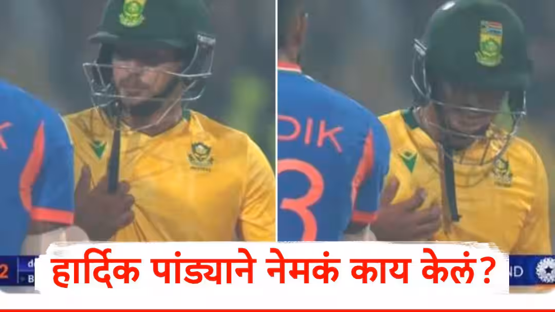 नाणेफेक जिंकत भारताने प्रथम गोलंदाजीचा निर्णय घेतला होता. यावेळी दक्षिण आफ्रिकेने फलंदाजी करताना 213 धावा ठोकल्या. प्रत्युत्तरात भारताने सर्व विकेट्स गमावत फक्त 162 धावा केल्या. यामुळे भारताचा 51 धावांनी पराभव झाला. दक्षिण आफ्रिकेकडून क्विंटन डीकॉकने 46 चेंडूत 90 धावा केल्या. क्विंटन डीकॉकने (क्विंटन डी कॉक) टीम इंडियाच्या सर्व गोलंदाजांना धू धू धुतलं. सामन्याचा सामनावीर म्हणून क्विंटन डीकॉकची निवड करण्यात आली. दरम्यान, क्विंटन डीकॉक आणि हार्दिक पांड्याचा एक व्हिडीओ सोशल मीडियावर व्हायरल होतोय. या व्हिडीओमध्ये हार्दिक पांड्या षटक संपताच क्विंटन डीकॉकची मस्ती करत नको तिकडे हात लावल्याचे दिसून येत आहे. (क्विंटन डी कॉक आणि हार्दिक पांड्या)