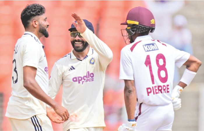 रवींद्र जाडेजा आणि मोहम्मद सिराज यांच्या जबरदस्त कामगिरीच्या जोरावर ‘टीम इंडिया’ने पहिल्या कसोटी क्रिकेट सामन्यात पाहुण्या वेस्ट इंडीजचा अवघ्या अडीच दिवसांत खेळ खल्लास करीत डावाने आणि 140 धावांनी पराभव करीत महाविजय साजरा केला. पहिल्या डावात नाबाद 104 धावांची शतकी खेळी केली आणि त्यानंतर 4 बळी टिपत जाडेजाने आपल्या सर्वांगीण क्षमतेची पुन्हा एकदा झलक दाखविली. सिराजने दोन्ही डावांत मिळून सात बळी घेत विंडीजची दाणादाण उडविली.