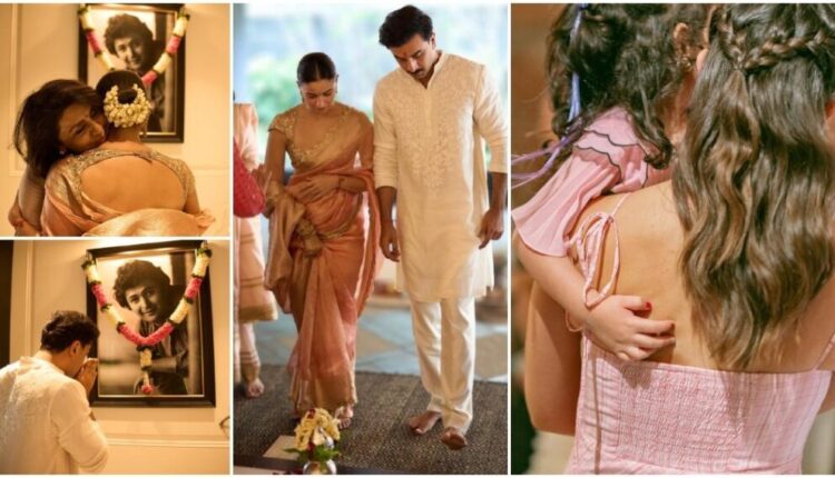 फोटोंमध्ये राहाचा द्विस्तरीय वाढदिवसाचा केक आणि रणबीर त्याचे वडील, ऋषी कपूर यांच्या फोटो फ्रेमला प्रार्थना करत आहे.