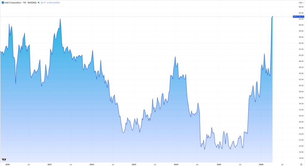 गुंतवणुकदारांचा विश्वास गमावल्यानंतर अनेक वर्षांनी, इंटेल अचानक मोठ्या बाजारपेठेतील रॅलीच्या केंद्रस्थानी सापडले आहे, जे या क्षेत्रातील सर्वोच्च कामगिरी करणाऱ्यांपैकी एक बनले आहे. S&P 500 निर्देशांक. एका आठवड्यात, शेअर्स 50% पेक्षा जास्त वाढले, ज्याने त्याच्या बाजार भांडवलात $100 अब्ज पेक्षा जास्त जोडले आणि कंपनीच्या वाढीचा विक्रम नोंदवला. वर्षाच्या सुरुवातीपासून, स्टॉक 72% वाढला आहे, जो मागील वर्षाच्या तुलनेत 84% ने वाढला आहे. अनेक घटक कार्यरत असताना, ते एकत्रितपणे एक महत्त्वपूर्ण बदल प्रतिबिंबित करतात: बाजार पुन्हा एकदा इंटेलला एआय इन्फ्रास्ट्रक्चरमध्ये एक पिछाडीवर न पडता एक धोरणात्मक मालमत्ता म्हणून पाहतो.