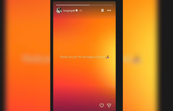 लुंगी एनगिडीला दुखापत झाल्यानंतर सर्वच स्तरातून तो लवकरात लवकर बरा व्हावा म्हणून प्रार्थना करण्यात आली. तसेच कालपासून (25 एप्रिल 2026) त्याच्या पहिल्या प्रतिक्रियेची चाहत्यांसह सर्वजण आतुरतेने वाट पाहत होते. अखेर आज लुंगी एनगिडीने आपल्या सोशल मीडिया अकाउंटवर मेसेज टाईप करत सर्वांचे आभार मानले आहेत. “Thank You For The Messages All Good” असं त्याने आपल्या इन्स्टाग्राम स्टोरीमध्ये लिहिलं आहे. त्यामुळे चाहत्यांचा जीव भांड्यात पडला असून. त्याने आता लवकरात लवकर मैदानात उतरून पुन्हा एकदा फलंदाजांच्या दांड्या गुल कराव्यात, अशी अपेक्षा चाहत्यांनी व्यक्त केली आहे.