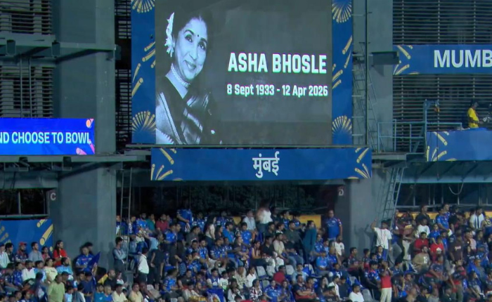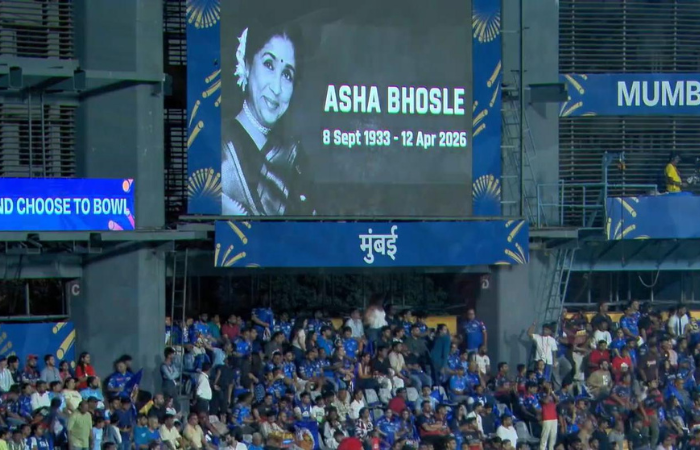 हिंदुस्थानच्या दिग्गज पार्श्वगायिका आशा भोसले यांचे रविवारी सकाळी निधन झाले. त्यांच्या निधनाने संपूर्ण देशभरात शोककळा पसरली असून मुंबई इंडियन्स आणि रॉयल चॅलेंजर्स बंगळुरू यांच्यात खेळल्या जात असलेल्या सामन्यापूर्वी दोन्ही संघांच्या खेळाडूंनी आशा भोसले यांना श्रद्धांजली अर्पण करत एक मिनिट मौन पाळले. मैदानावरील हा क्षण अत्यंत भावनिक होता आणि प्रेक्षकही स्तब्ध झाले होते. याशिवाय, दोन्ही संघांच्या खेळाडूंनी दंडावर काळी फित बांधून आशाताई यांना मानवंदना दिली. तसेच वानखेडेवर संपूर्ण लढतीवेळ आशा भोसले यांची गाणी वाजवण्यात आली..
