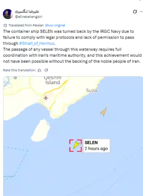 रिअर ॲडमिरल अलिरेझा तंगसिरी म्हणाले की, 'कायदेशीर प्रोटोकॉल' पाळण्यात अयशस्वी झाल्यामुळे आणि सामुद्रधुनीतून जाण्याची परवानगी न मिळाल्यामुळे जहाज मागे वळवण्यात आले. जहाजांनी आता इराणी सागरी अधिकार्यांसह पारगमन समन्वयित केले पाहिजे.