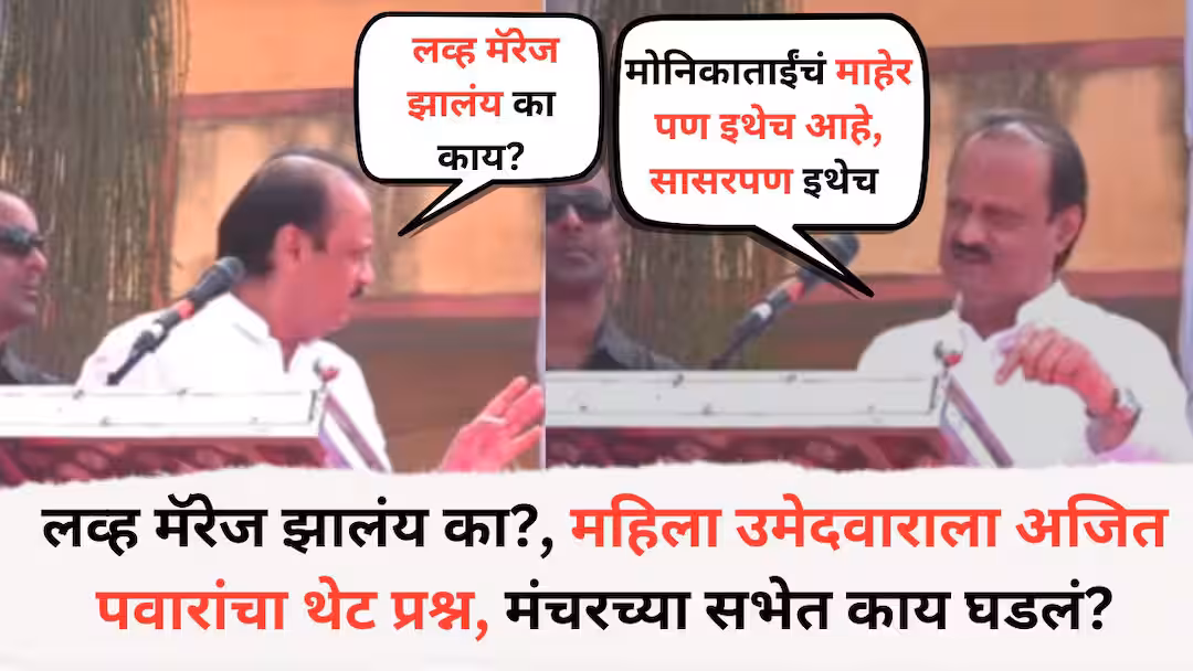 पुणे: पुण्याच्या मंचरमध्ये आज राष्ट्रवादी काँग्रेस पक्षाचे अध्यक्ष आणि राज्याचे उपमुख्यमंत्री अजित पवार (NCP Ajit Pawar) आणि राज्याचे उपमुख्यमंत्री आणि शिवसेना पक्षाचे मुख्य नेते एकनाथ शिंदे (मराठी) एकमेकांच्या समोर उभे ठाकणार आहेत. मंचर नगरपंचायत काबीज करण्यासाठी अजित पवारांची राष्ट्रवादी आणि भाजपची युती झाली आहे, त्यांचा सामना हा शिंदेंच्या शिवसेनेशी आहे. आज अजित पवाराच्या राष्ट्रवादीची आणि भाजपची सभा आयोजित करण्यात आली आहे. दरम्यान आपल्या वेगवेगळ्या वक्तव्यामुळे वारंवार चर्चेत येणारे अजित पवार आज पुन्हा आपल्या एका प्रश्नामुळे पुन्हा चर्चेचा विषय ठरलेत. अजित पवारांनी थेट महिला उमेदवाराला मंचावर लव्ह मॅरेज झालंय का? असा प्रश्न उपस्थित केला आहे. अजित पवारांनी मंचर नगरपंचायतीच्या नगराध्यक्ष पदाच्या उमेदवार मोनिका बाणखेले यांना लव्ह मॅरेज झालंय का? असा प्रश्न विचारला. सासर आणि माहेर एकाच गावात आहे, म्हणून हा प्रश्न विचारल्याचं स्पष्टीकरणही अजितदादांनी दिलं आहे.