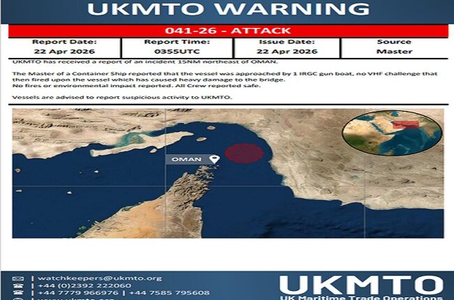 नवी दिल्ली. युनायटेड किंगडम मेरीटाईम ट्रेड ऑपरेशन्सने नोंदवले की इस्लामिक रिव्होल्यूशनरी गार्ड कॉर्प्सने ओमानच्या उत्तर-पूर्वेस 15 नॉटिकल मैल दूर असलेल्या गनबोटवर गोळीबार केला. या गोळीबारात कंटेनर जहाजाच्या पुलाचे मोठे नुकसान झाले आहे. जहाजाच्या कॅप्टनने नोंदवले की IRGC गनबोट जहाजाजवळ आली, ज्याने गोळीबार करण्यापूर्वी VHF चेतावणी दिली नाही. ट्विटरवरील एका पोस्टमध्ये असे म्हटले आहे की हल्ल्यामुळे पुलाचे मोठ्या प्रमाणात नुकसान झाले आहे, परंतु आग किंवा पर्यावरणीय परिणामांचे कोणतेही वृत्त नाही.