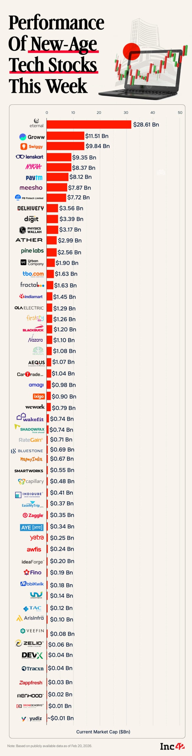 16-20 फेब्रुवारी दरम्यान, Inc42 च्या कव्हरेज अंतर्गत 52 नवीन-युगातील टेक कंपन्यांपैकी 36 कंपन्या 0.02% ते जवळपास 20% च्या श्रेणीत घसरल्या.