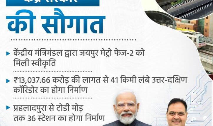 राजस्थानची राजधानी जयपूरच्या विकासाला नवी गती देण्यासाठी केंद्र सरकारने मोठा निर्णय घेतला आहे. पंतप्रधान नरेंद्र मोदी यांच्या अध्यक्षतेखाली केंद्रीय मंत्रिमंडळ जयपूर मेट्रो फेज-2 प्रकल्पाला मंजुरी मिळाली आहे. या महत्त्वाच्या प्रकल्पावर अंदाजे ₹13,037.66 कोटी रुपये खर्च येईल.